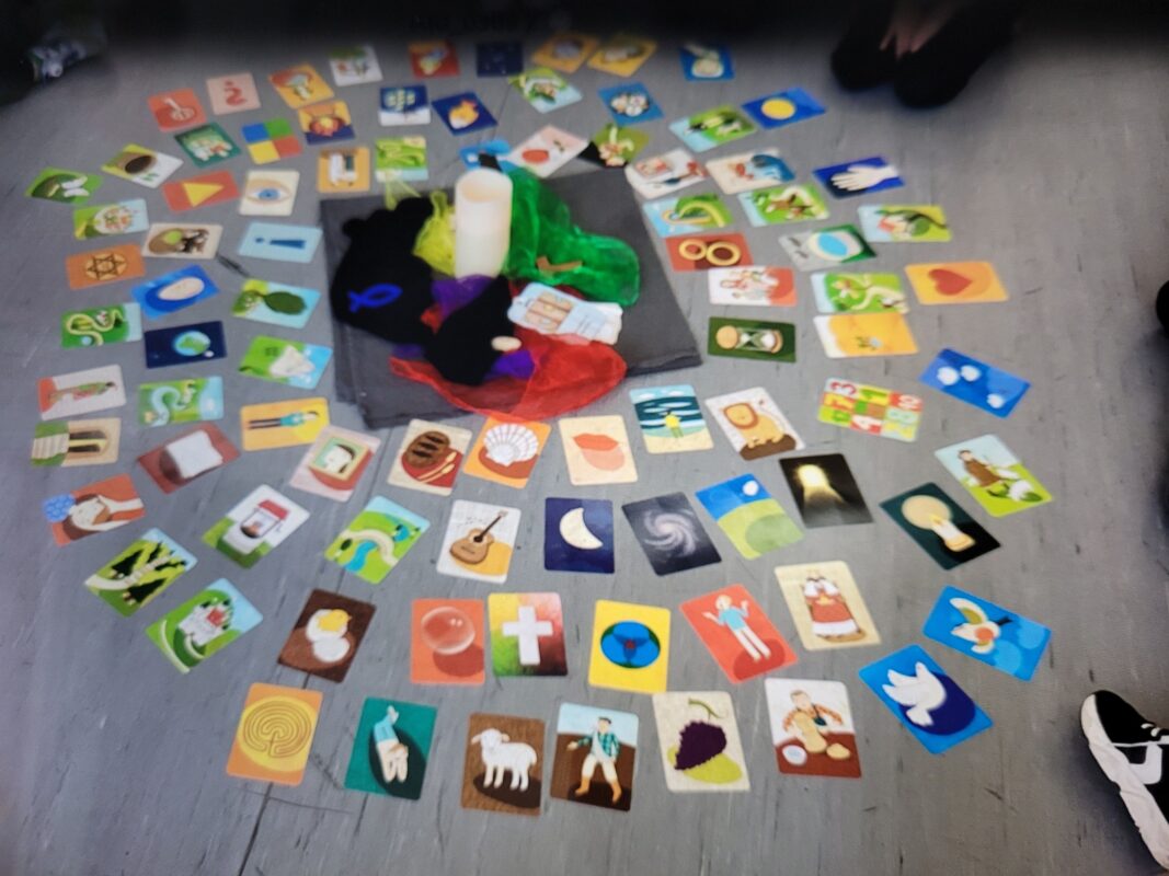 Auch die Klasse 4 ist mit einem Bodenbild in die Osterzeit gestartet. Dafür nutzten die Kinder die Bildkarten von Rainer Oberthür. Auf den Bildkarten sind verschiedene Alltagssituationen, Naturbilder und symbolische Darstellungen zu sehen – zum Beispiel Wege, Hände, Licht, Menschen in Begegnungen oder Szenen aus dem täglichen Leben. Die Bilder laden dazu ein, über das eigene Leben, über Gefühle, Erfahrungen und wichtige Momente nachzudenken.